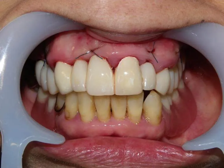 50代、女性、子供の頃から、歯に強いコンプレックスを持っていました。きっと、諦めかけて当医院に来院されました。上あごは、11本歯牙がありましたが、全てグラグラ、保存できません。下あごにも奥歯を6本失って、義歯が入っていました。まずは、ご自分の残っている歯を、そして歯茎を徹底的に健康にすることから始めました。初診から、5ヶ月が経ちました。歯茎が健康になったら、噛み合わせを安定させることも重要なのです。上あご11本中、まったく機能しない歯を6本抜いて、抜いた傷口を温存し、なんとか支えられそうな歯5本で、仮歯(ブリッジ)を本日装着致しました。