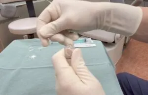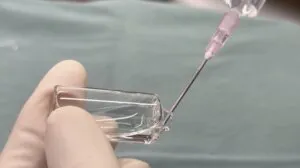 4、薬液をシリンジで吸入するときは、アンプルの底部で吸引せず、できればネック部に薬液を移動させ、注射針のカット面を上に向けて吸引するようにする。微細なガラス片の混入を避けるためである。アンプル内の容量は、すべて吸引できないものとして少し多く入っている。